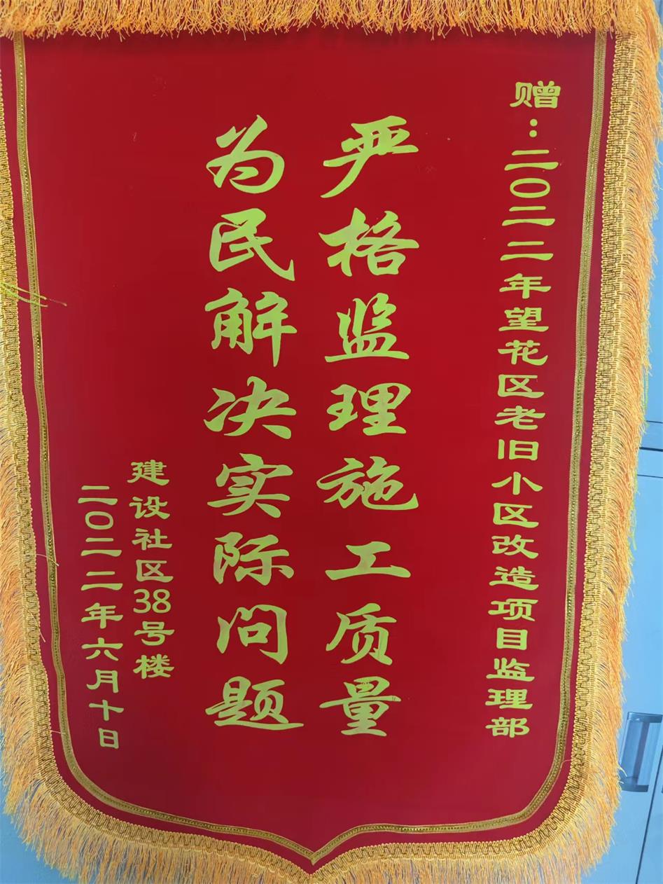 千濤萬漉雖辛苦,吹盡狂沙始到金。一面錦旗既是一份肯定。我們將秉承“誠實、責任、專業(yè)、超越”的監(jiān)理精神,接受政府和市民的共同監(jiān)督,一如既往、不忘初心、盡職盡責,為推動老舊小區(qū)改造,優(yōu)化小區(qū)環(huán)境治理,建設文明城市做出應有的貢獻!
