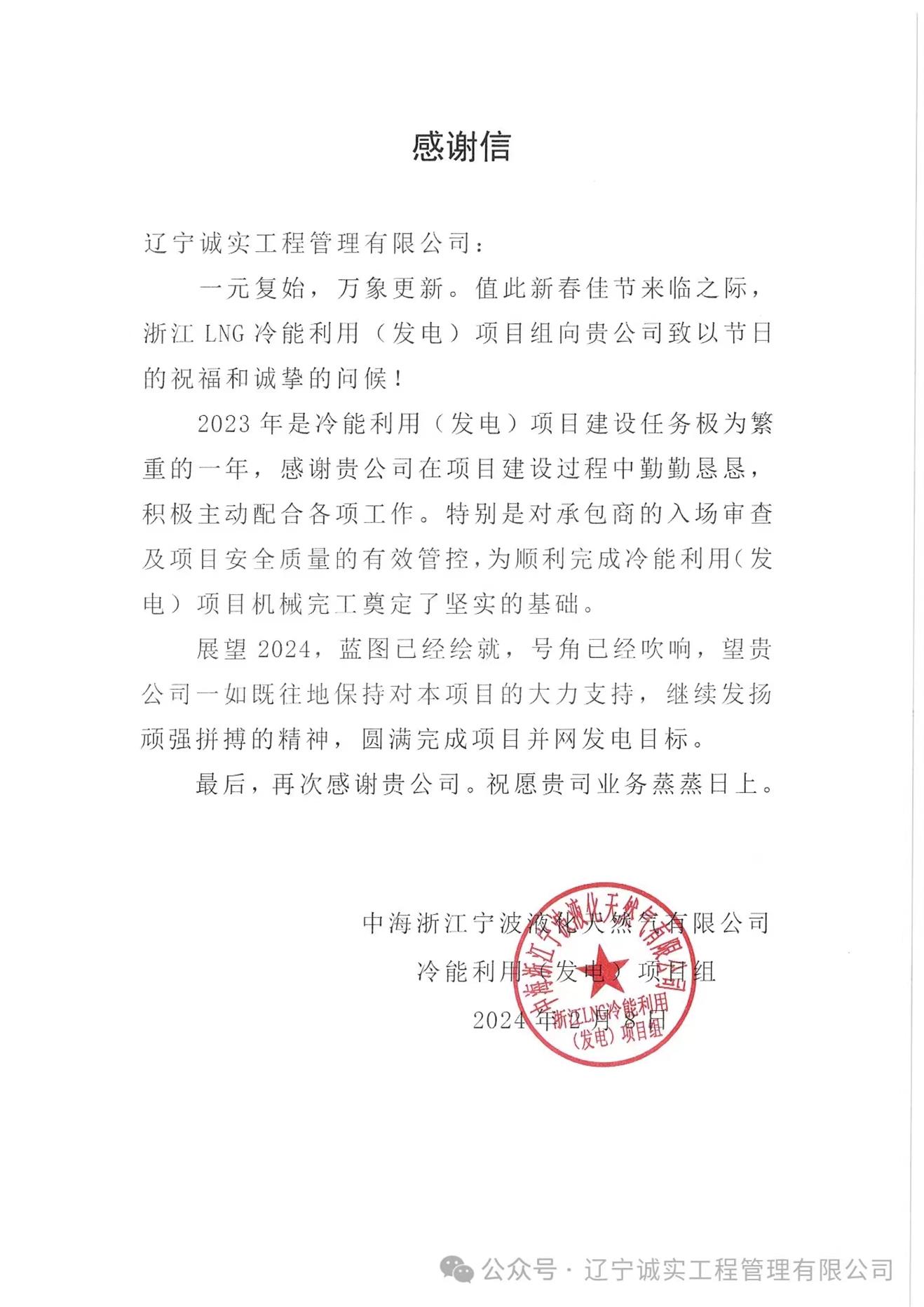 浙江LNG冷能利用(發(fā)電)項(xiàng)目組向公司發(fā)來了感謝信,信中肯定了公司項(xiàng)目部人員在2023年的努力,特別是對于承包商入場審查及項(xiàng)目安全質(zhì)量的有效管控,為項(xiàng)目機(jī)械完工奠定了堅實(shí)的基礎(chǔ)。該項(xiàng)目是積極響應(yīng)國家及浙江省“十四五”規(guī)劃的節(jié)能減排政策,落實(shí)“綠色低碳”發(fā)展戰(zhàn)略的示范項(xiàng)目,項(xiàng)目投產(chǎn)后,預(yù)計年凈發(fā)電量約為2408萬度,節(jié)省標(biāo)準(zhǔn)煤超3000tce,年減少CO₂排放可達(dá)18000多噸。展望2024年,項(xiàng)目部在黃思敏總監(jiān)的帶領(lǐng)下,將認(rèn)真執(zhí)行監(jiān)理職責(zé),積極推進(jìn)項(xiàng)目建設(shè),爭取項(xiàng)目早日建成投產(chǎn)。